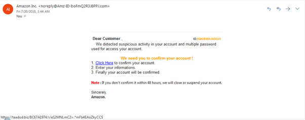 In the example below, the phishing email appears to have been sent from Amazon, claiming that Amazon has detected suspicious activity on the account and that multiple passwords have been used to access it. However, note how the message is designed to induce fear by threatening to close the account if the user does not respond within 48 hours.