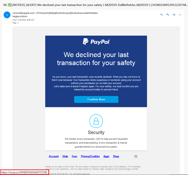 Below is an example demonstrating how attackers can spoof a notice from a legitimate organisation, such as PayPal. In the image, the email appears to originate from PayPal, but hovering the mouse over the “Confirm Now” button reveals that the actual URL (in the red triangle) redirects to a different website.